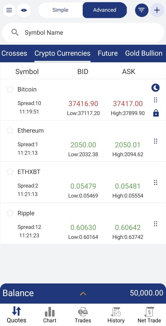 If Advanced is enabled users can get live prices of various symbols with its information in the Quotes screen like Spread, High, and Low, and time.